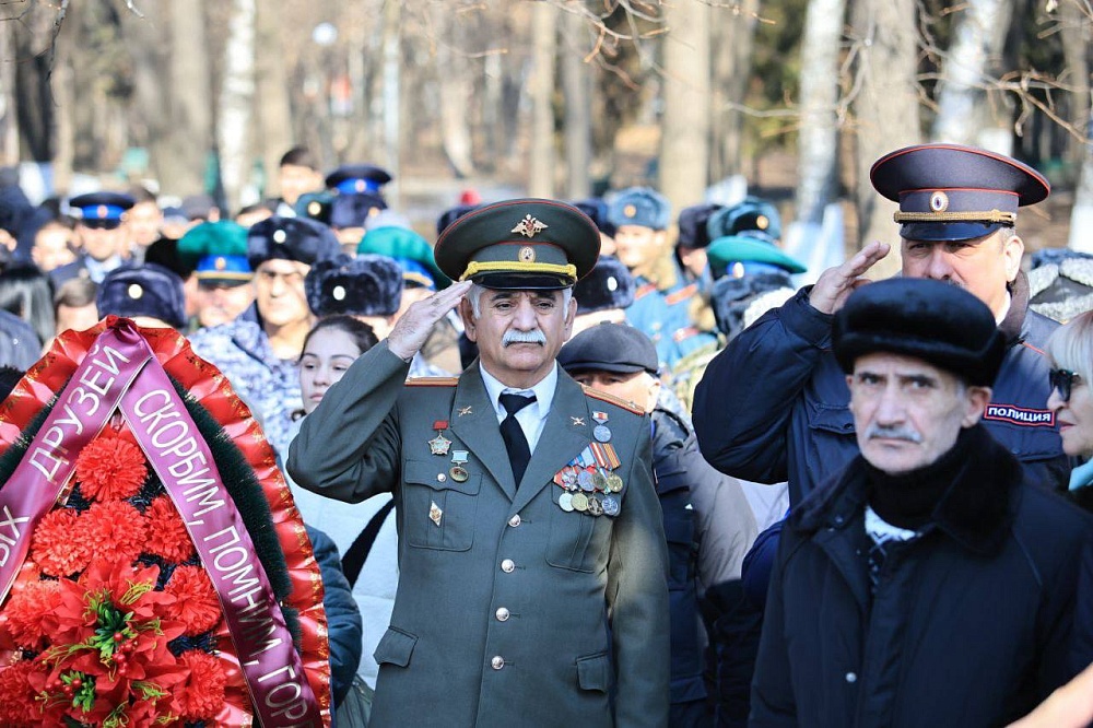 Память погибших воинов почтили Глава Северной Осетии-Алании вице-адмирал Сергей Меняйло, мэр Владикавказа Вячеслав Мильдзихов, члены правительства и депутаты парламента, ветераны и участники войн, родственники погибших солдат, ученики кадетских классов и сотрудники правоохранительных структур.