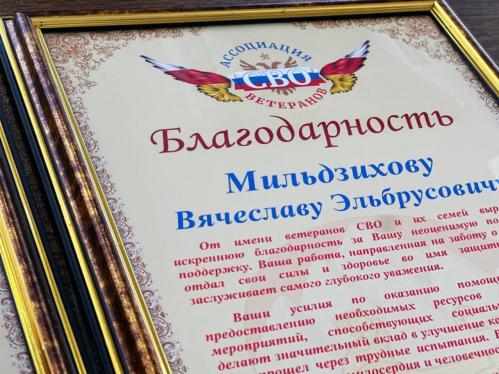 Медаль и благодарность за значительный вклад в поддержку Вооруженных сил, помощь участникам специальной военной операции, членам «Ассоциации ветеранов специальной военной операции» и их семьям мэру города вручил председатель Ассоциации ветеранов СВО Олег Магкеев.