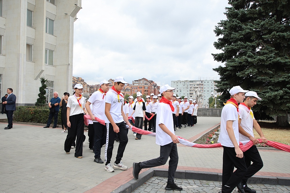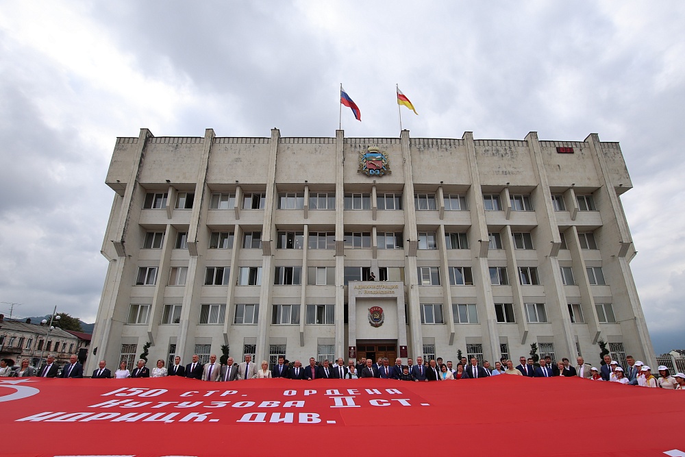 Масштабную 20-метровую копию Знамени Победы развернули у здания администрации ВладикавказаВ торжественной акции приняли участие ветераны Великой Отечественной войны и герои СВО, Глава республики Сергей Меняйло, глава Владикавказа Вячеслав Мильдзихов, представители городов воинской славы.