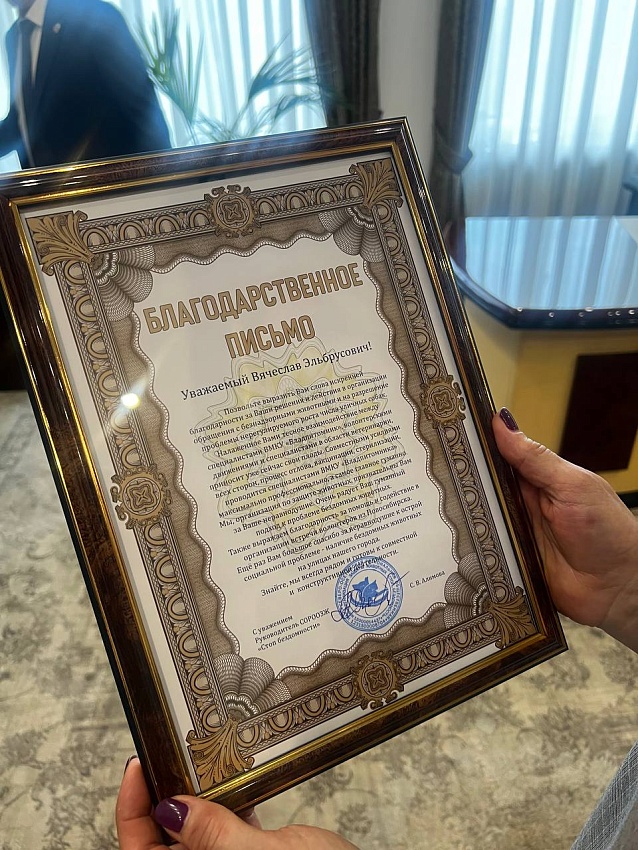 Представитель волонтёрского движения передала Вячеславу Мильдзихову благодарность за профессиональную работу ВМКУ «Владпитомник» по гуманному отлову, вакцинации и стерилизации животных. Волонтеры особо отметили содействие администрации в организации мероприятий по стерилизации собак специалистами из Новосибирска.