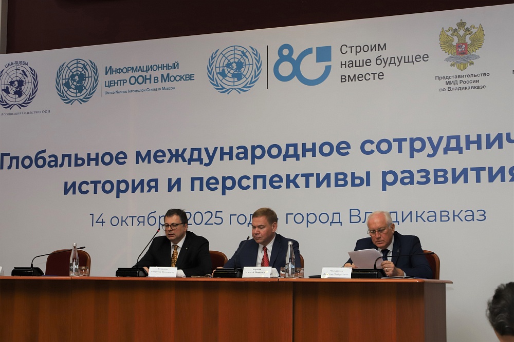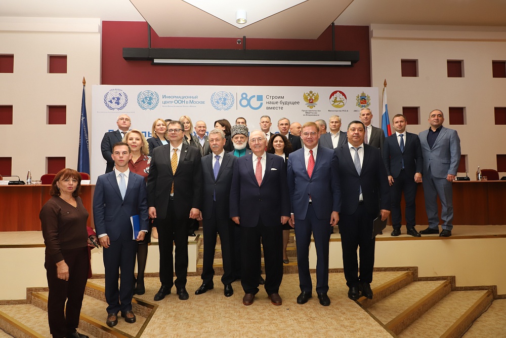 В АМС Владикавказа прошла конференция, посвященная 80-летию ООНПочетными гостями мероприятия стали директор Информационного центра ООН в России Владимир Кузнецов, вице-президент Российского совета по международным делам, зампредседателя государственной комиссии РФ по делам ЮНЕСКО Александр Дзасохов и мэр Владикавказа Вячеслав Мильдзихов.