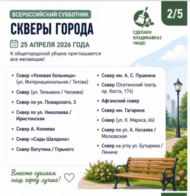 25 апреля 2026 года в столице Северной Осетии пройдёт ежегодный Всероссийский субботник.В этот день участники приведут в порядок дворовые территории и общественные пространства, очистят газоны и пешеходные зоны.