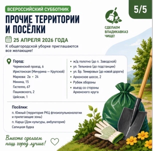 Уже сегодня в столице Северной Осетии пройдёт ежегодный Всероссийский субботник, в рамках нацпроекта «Инфраструктура для жизни». Присоединяйтесь и внесите свой вклад в благоустройство Владикавказа Начало в 10:00. #ВсероссийскийСубботник #МыВместеЗаЧистоту #МыЗаЧистоту #ДвижениеЭкосистема #Росмолодёжь