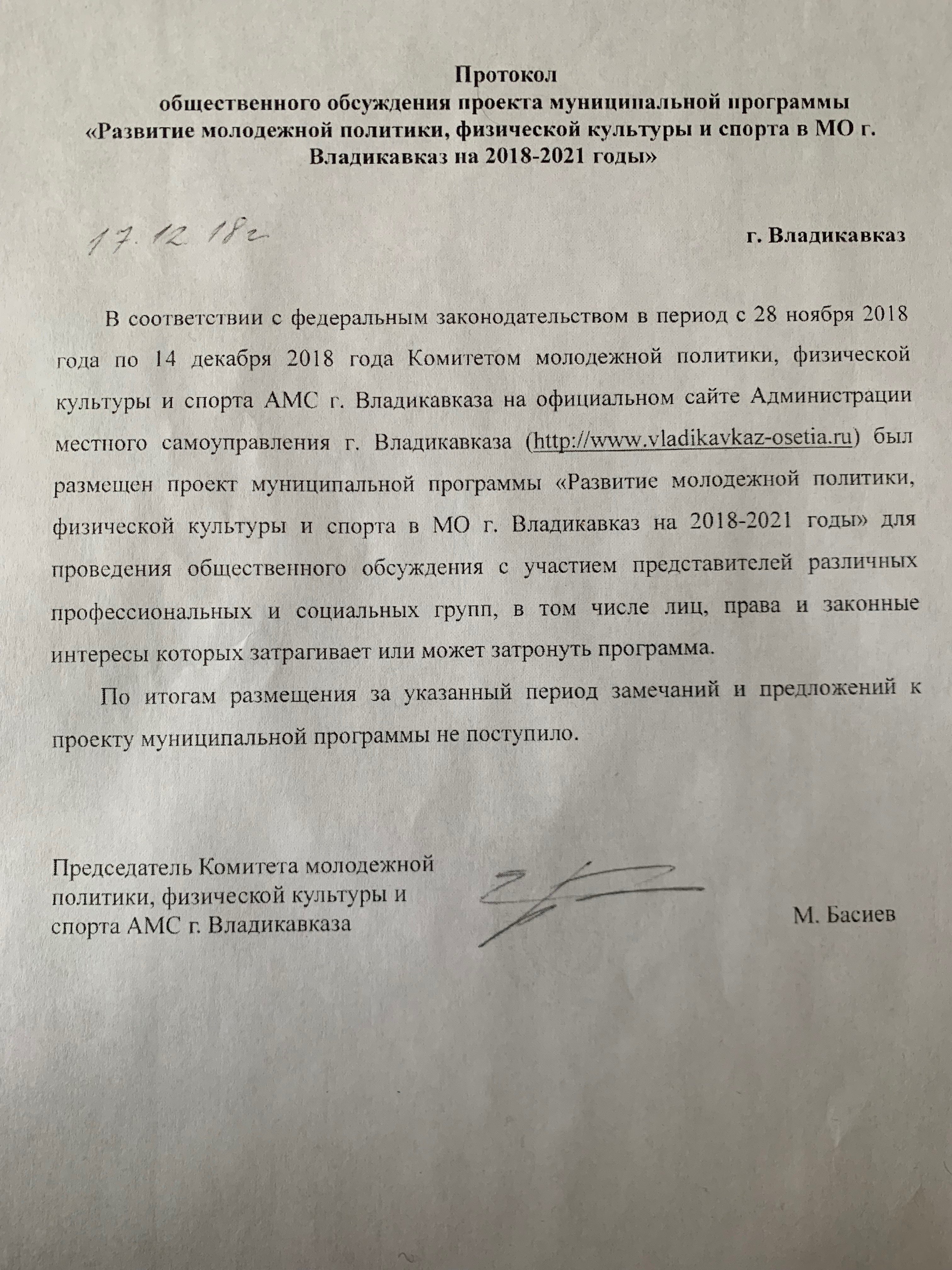 Протокол общественного обсуждения проекта муниципальной программы Развитие МПФКиС в г.Владикавказ на 2018-2021 г.