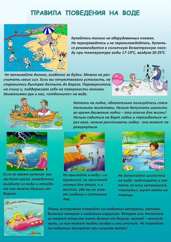 * Если нет поблизости оборудованного пляжа, надо выбрать безопасное место для купания с твёрдым песчаным, не засоренным дном, постепенным уклоном.