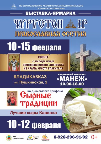 С 10 по 15 февраля в городе Владикавказе в СК «Манеж» по благословению Святейшего Патриарха Московского и всея Руси Кирилла начнет свою работу православная книжная выставка-форум «Радость Слова» и по благословению архиепископа Владикавказского и Аланского Герасима ко Дню святого Трифона состоится православная выставка-ярмарка «Чырыстон ИР. Православная Осетия».