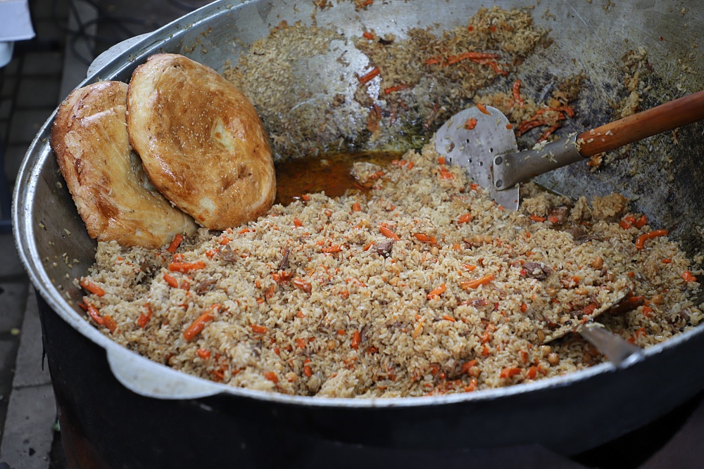 Гостей праздника угощали вкусным таджикским пловом. Попробовать национальное блюдо с лепешкой мог каждый желающий.
