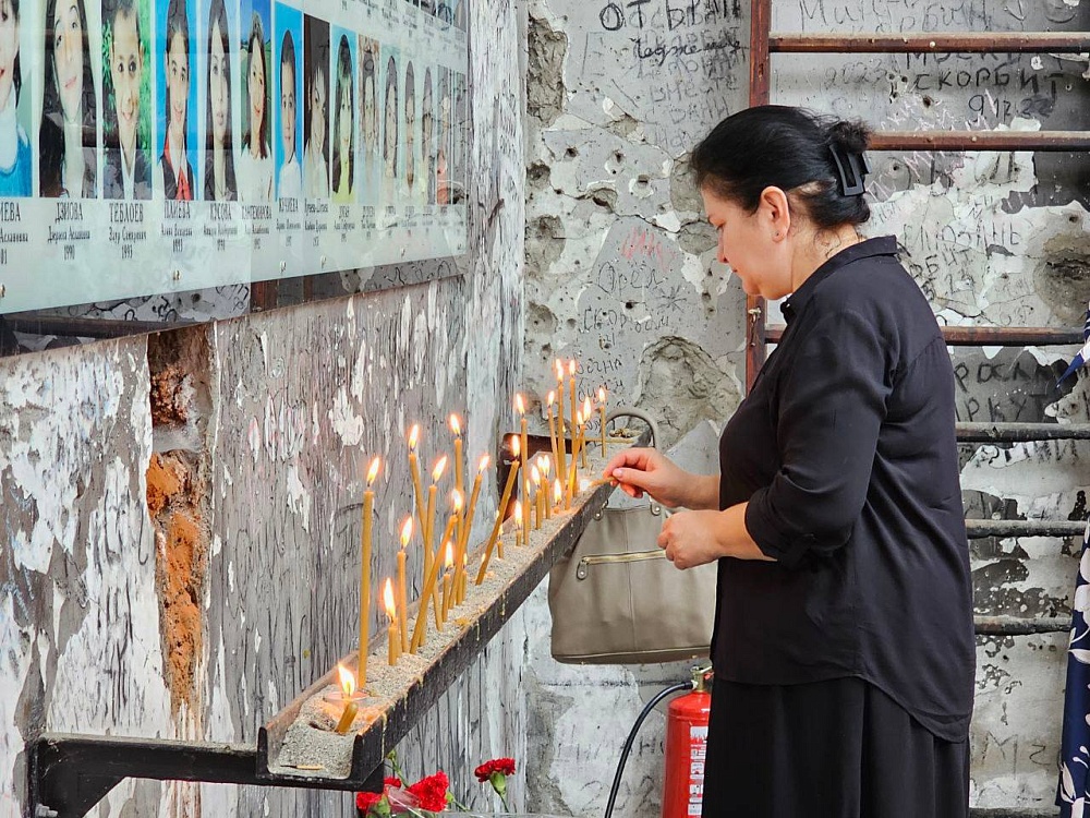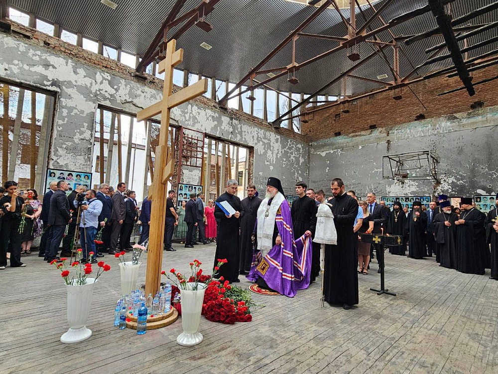 Участники памятной церемонии возложили цветы к подножью креста, установленного в центре бывшего школьного спортзала, и зажгли свечи у портретов погибших заложников. Здесь же была отслужена заупокойная лития по погибшим в теракте.