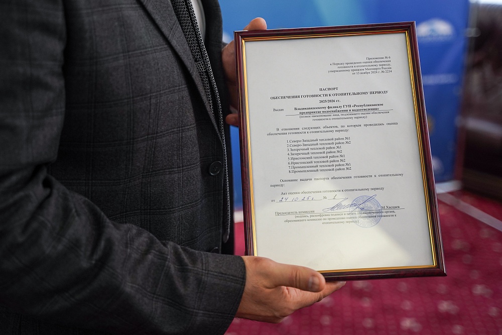 Городская комиссия оценила готовность к отопительному сезону 2025-2026 годов восьми тепловых районов Владикавказа и подготовила акт готовности. Сегодня заместитель главы АМС Владикавказа Маирбек Хасцаев вручил документ руководителю филиала Виталию Бокоеву. Хасцаев поздравил коллег со своевременным получением паспорта и поблагодарил коллектив Владикавказского Водоканала за проделанную совместную работу в рамках подготовки к отопительному сезону. Отметим, что по регламенту первыми паспорта и акты готовности получают управляющие организации, затем ресурсоснабжающие организации и только потом муниципальные образования.