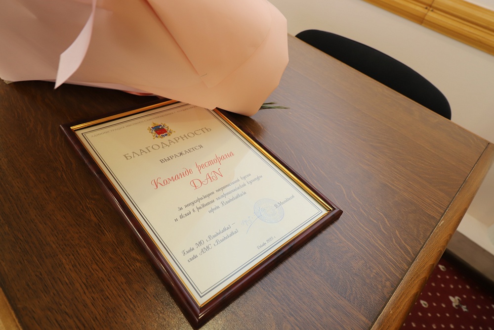 Мэр Владикавказа Вячеслав Мильдзихов встретился с командой ресторана DAN, которая стала победителем всероссийского конкурса на VIII форуме лидеров фуд-индустрии «Пальмовая ветвь».Владикавказцы стали лучшими в совместной с проектом «География России» номинации «За продвижение национальной кухни».