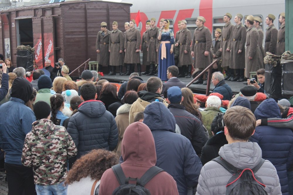Платформа железнодорожной станции «Владикавказ», на которую прибыл состав, стала главной действующей площадкой. Агитбригада поезда выступила с концертной программой на открытой платформе военного железнодорожного состава. Одетые в военную форму времен Великой Отечественной войны работники культуры смогли перенести зрителей в 1945 год, когда было объявлено о Победе советского народа в Великой Отечественной войне. Всех пришедших на станцию ветеранов ВОВ, гостей угощали полевой кухней под песни военных лет.