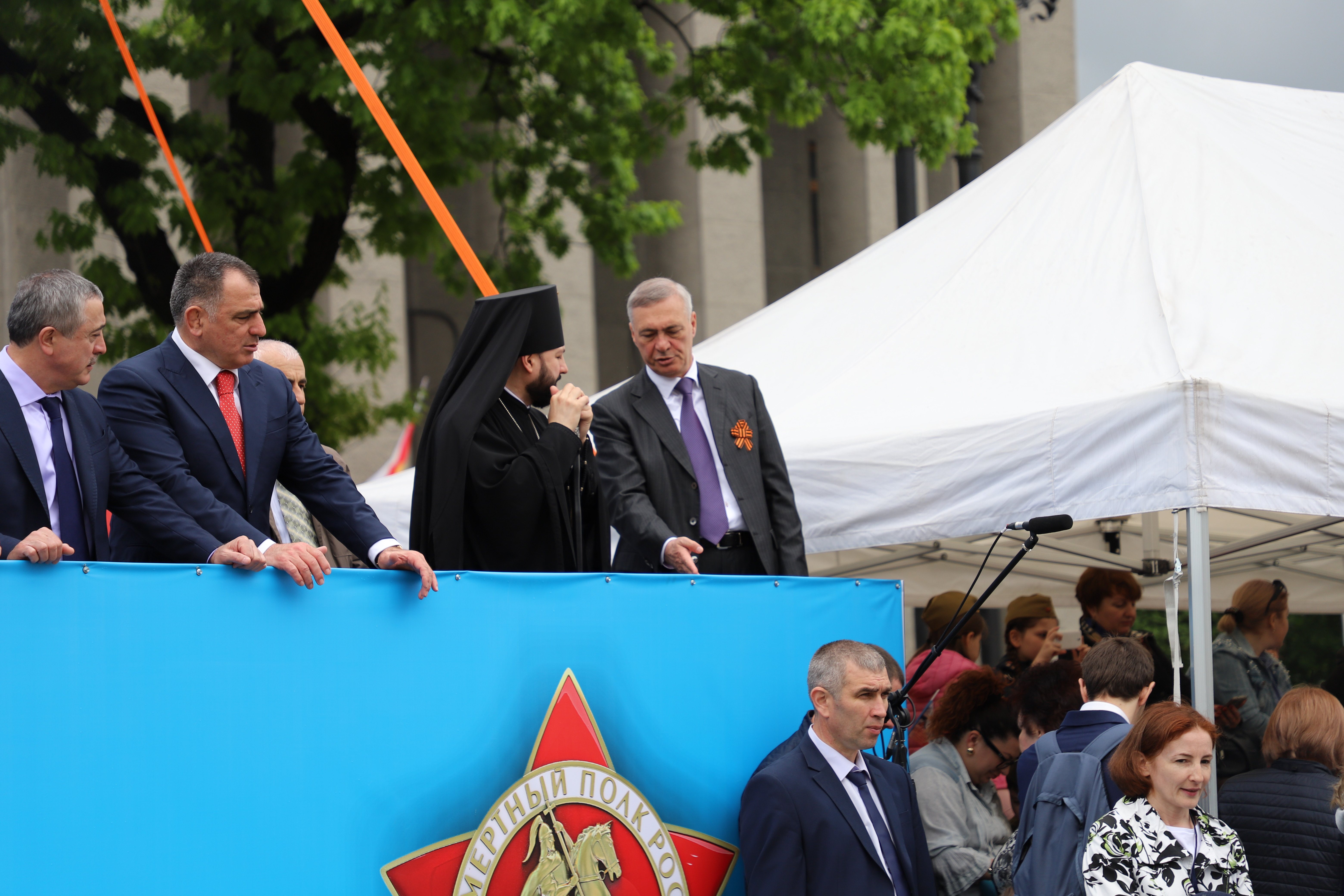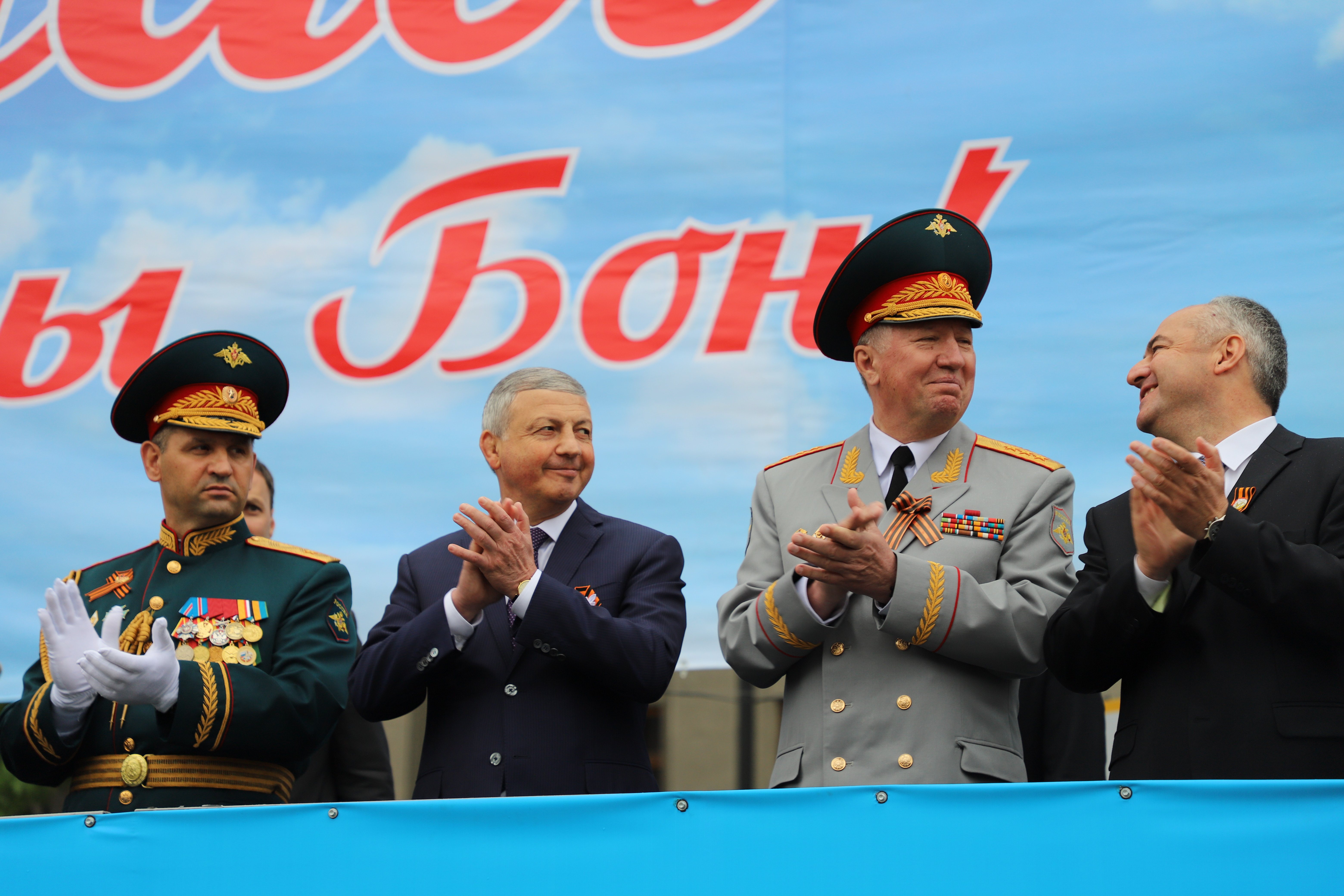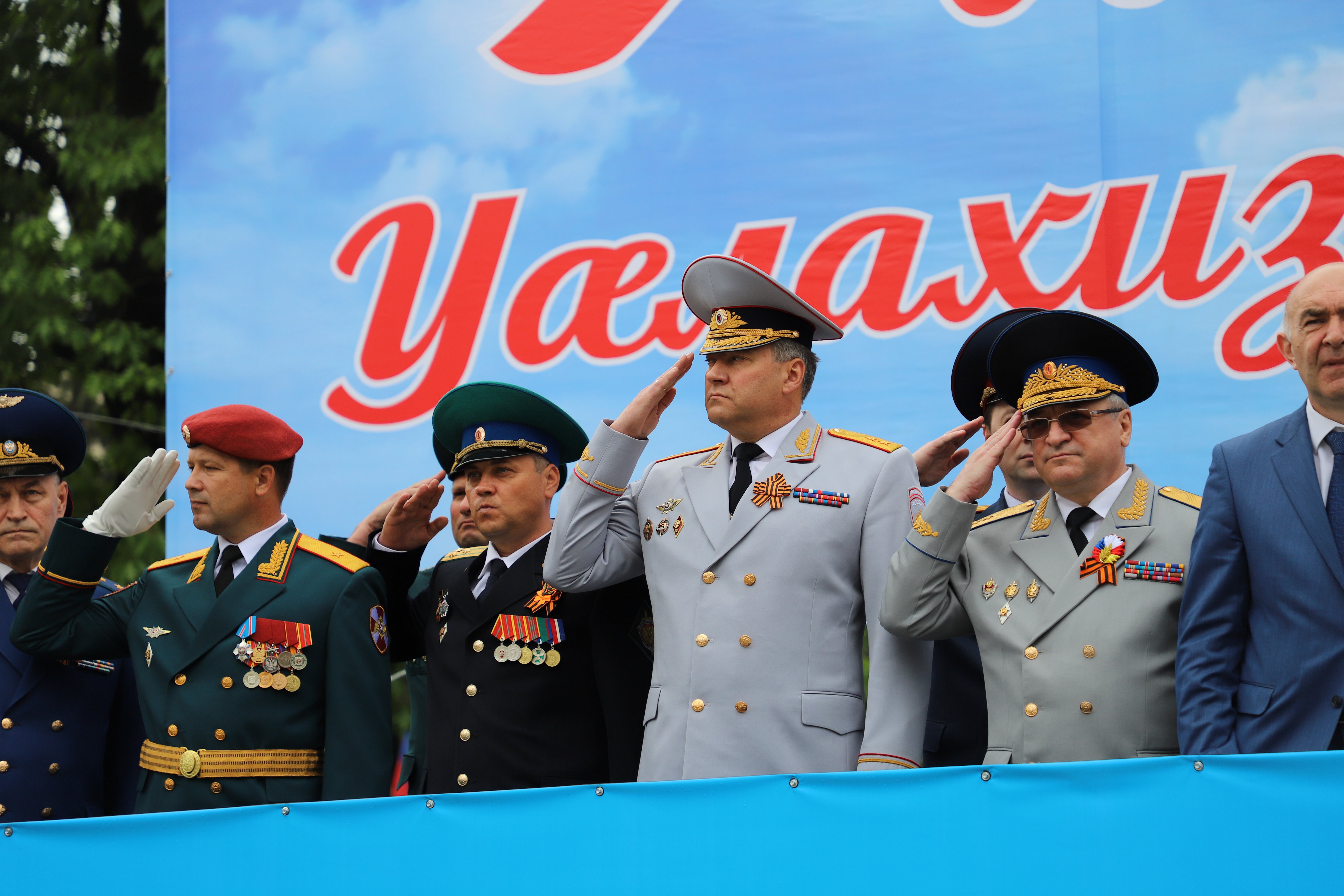 В параде приняли участие Глава РСО-Алания Вячеслав Битаров, Председатель Правительства Таймураз Тускаев, сенатор Арсен Фадзаев, глава АМС г.Владикавказ Борис Албегов, председатель Собрания представителей города Махарбек Хадарцев, члены кабинета министров, руководители силовых структур и ведомств, представители общественных, религиозных организаций и другие.