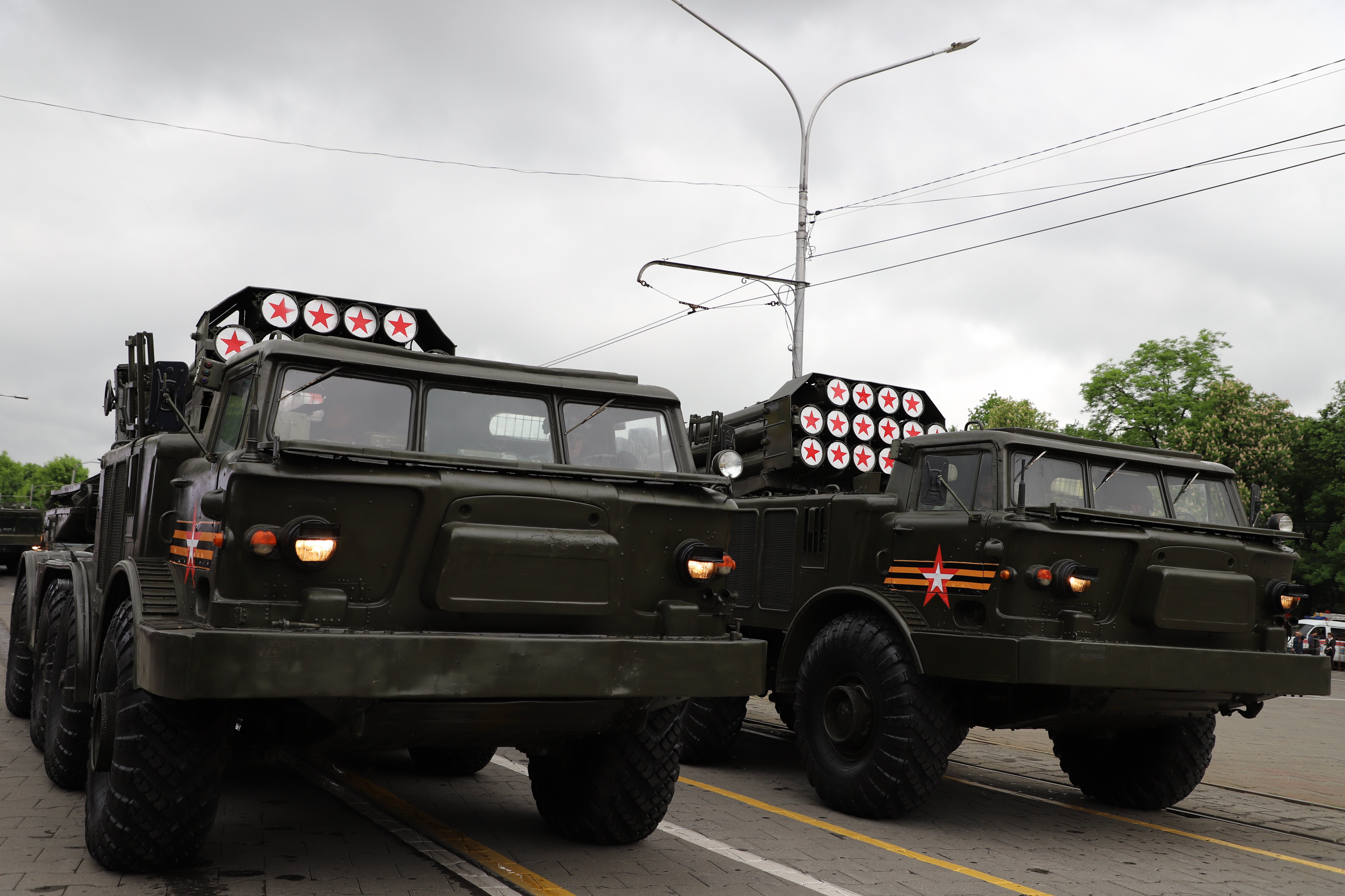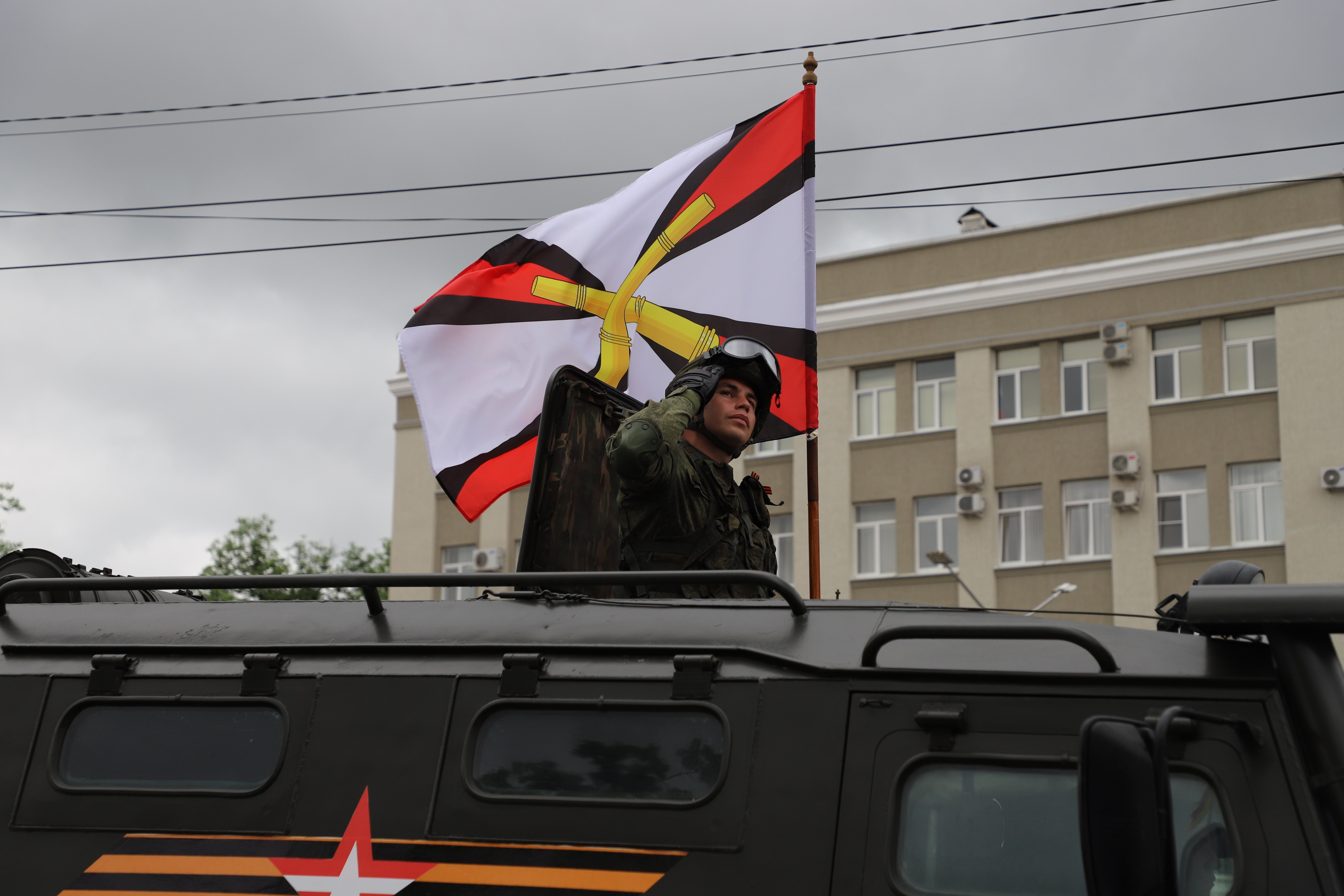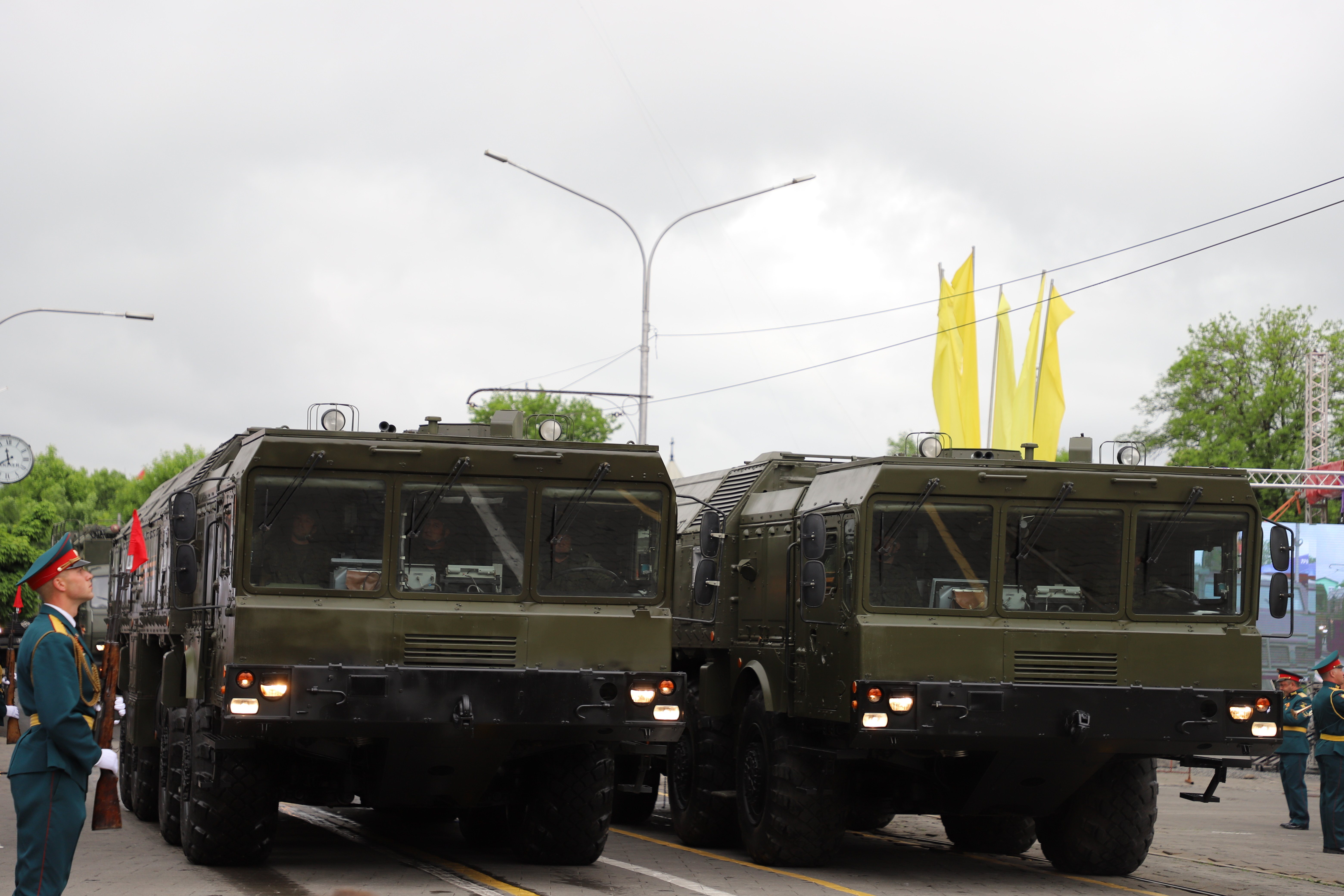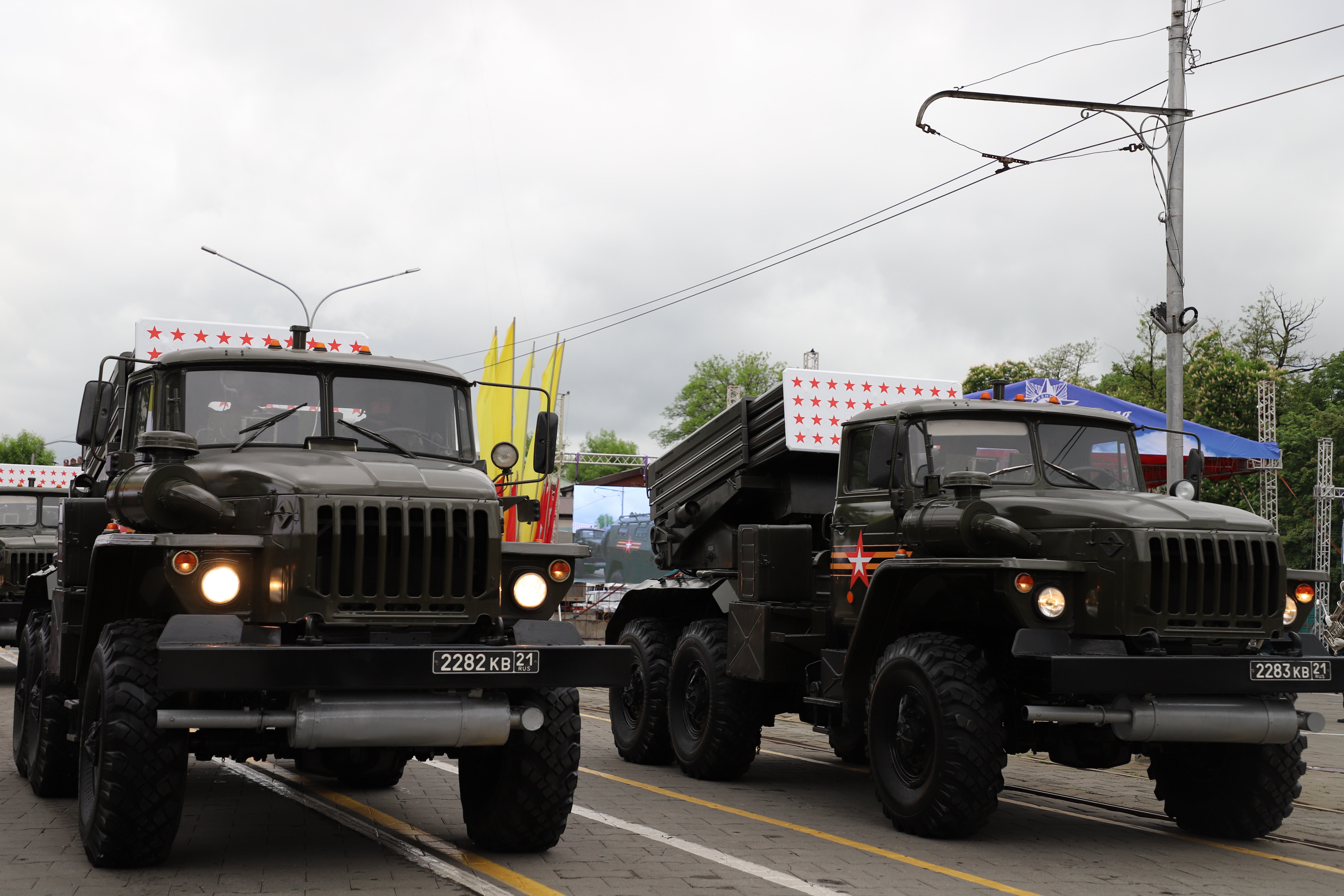 После прохождения пеших командных расчетов на площадь Свободы въехала военная техника. Перед многочисленными зрителями по брусчатке проследовали автомобили повышенной проходимости, колонна бронетранспортеров БТР 82-А, модернизированная реактивная система залпового огня «Торнадо», принятая на вооружение в 2013 г. Впервые в торжественном марше приняли участие ракетные комплексы «Искандер», с этого года находящиеся на вооружении 58-й армии.