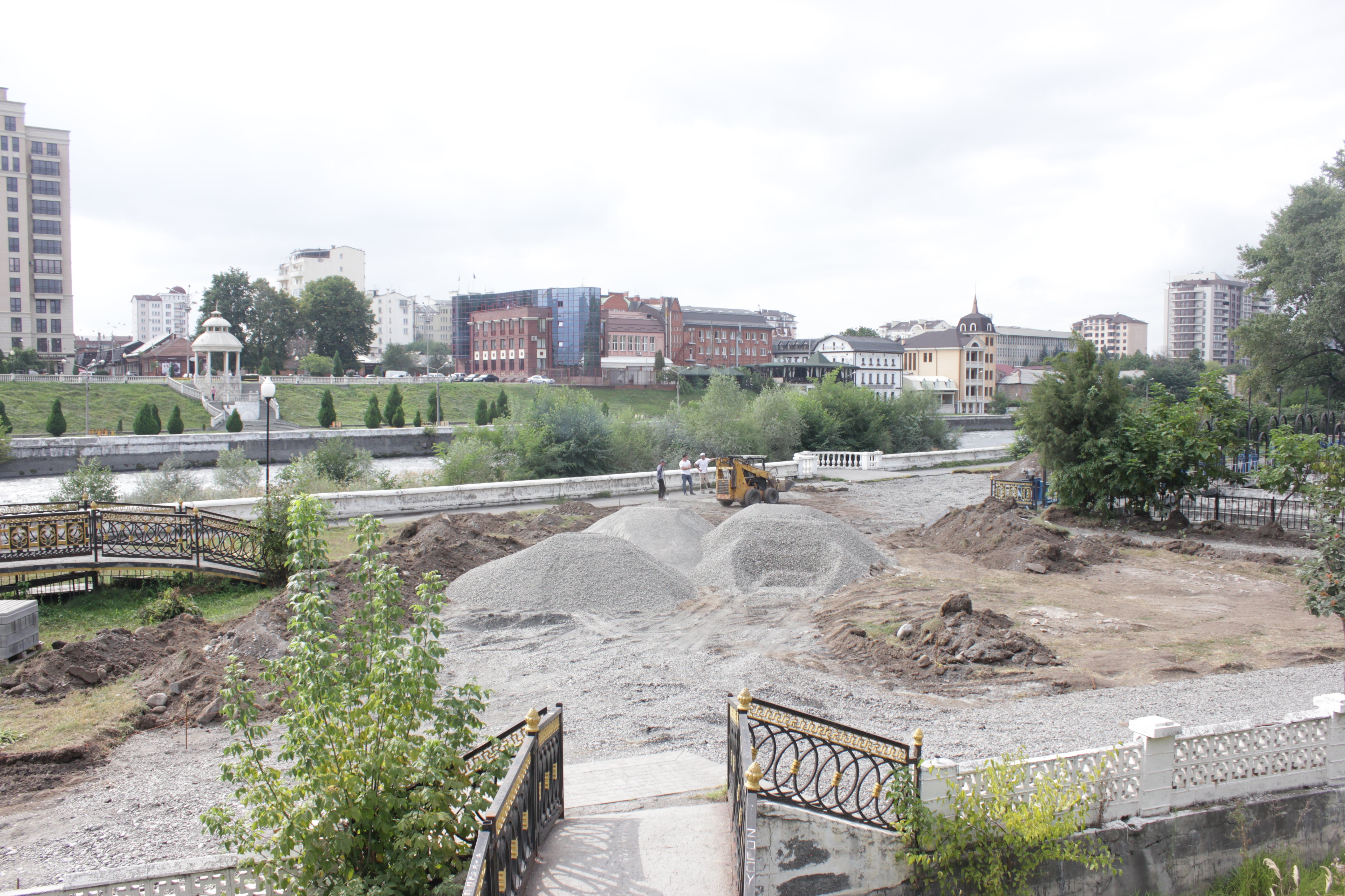 - План работ на первом этапе включает замену асфальтового покрытия на более эстетичную и прочную брусчатку, высадку деревьев, устройство дорожек, газонов, клумб, освещения, а также установку около ста современных скамеек и урн, реконструкцию мостиков, - рассказал Хетаг Медоев.