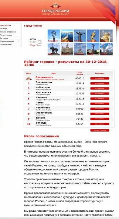 Итоги голосования 2018 года были подведены 30 декабря. Владикавказ, набрав 400 010 голосов, возглавил рейтинг лучших городов и стал национальным символом России. Всего в голосовании приняли участие более 6 миллионов россиян.