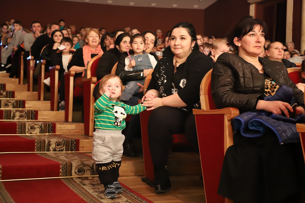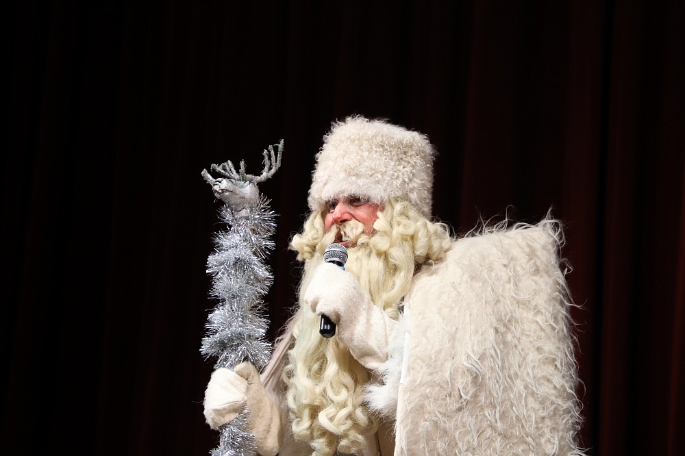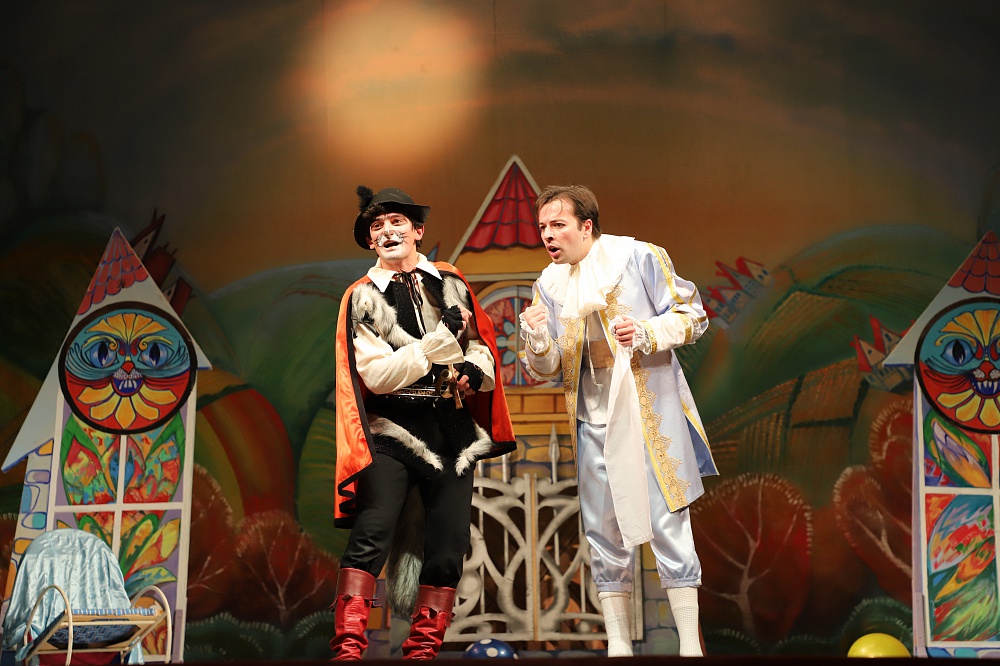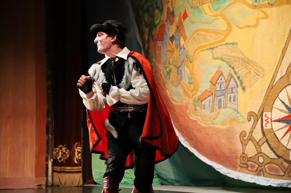 Перед началом спектакля со сцены юных горожан поприветствовали главные герои праздника – Дед Мороз и Снегурочка. Артисты театра представили детям города спектакль на родном языке «Кот в сапогах». Ребята с интересом следили за сюжетом, со смехом и аплодисментами радуясь успехам персонажей.