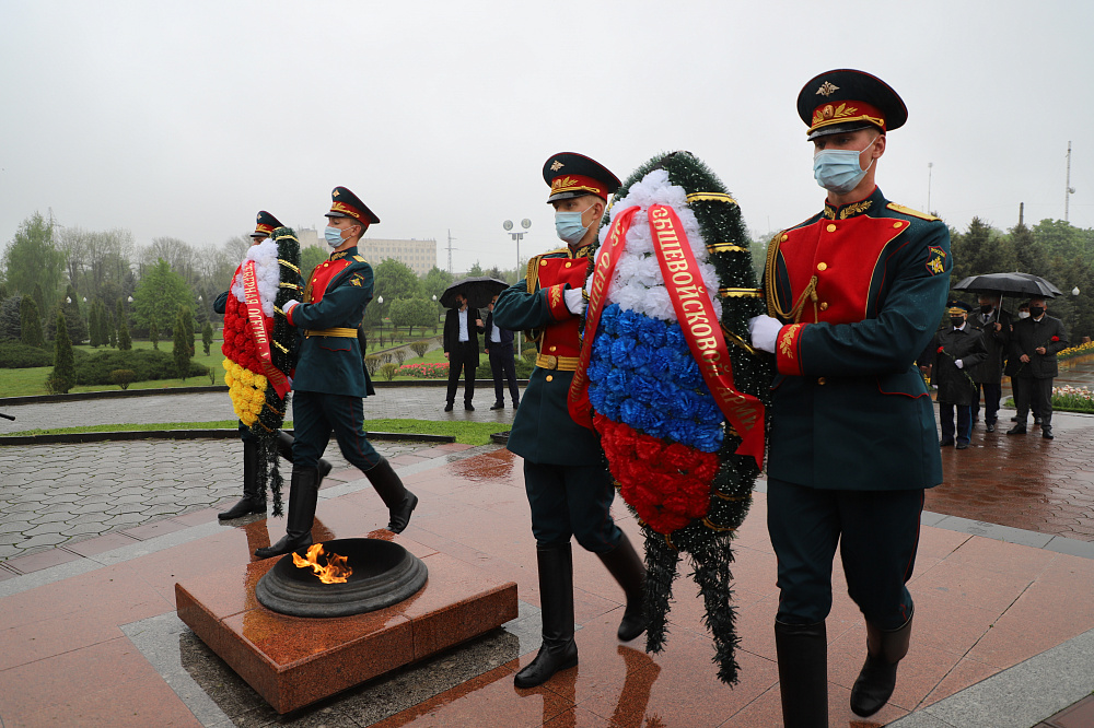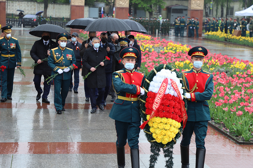 Сегодня, 9 мая в честь празднования годовщины Великой Победы традиционное возложение цветов к монументам воинов, павшим в Великой Отечественной войне, прошло по всей республике. Во Владикавказе на Мемориале Славы и на Аллее Славы почтить память героев пришли Глава РСО-Алания Вячеслав Битаров, Председатель Парламента Алексей Мачнев, Председатель Правительства Таймураз Тускаев, командующий 58-й армией генерал-майор Сергей Рыжков, глава мо г.Владикавказ Русланбек Икаев, глава АМС г.Владикавказ Тамерлан Фарниев, Председатель Совета ветеранов Солтан Каболов. Собравшиеся почтили память павших минутой молчания.