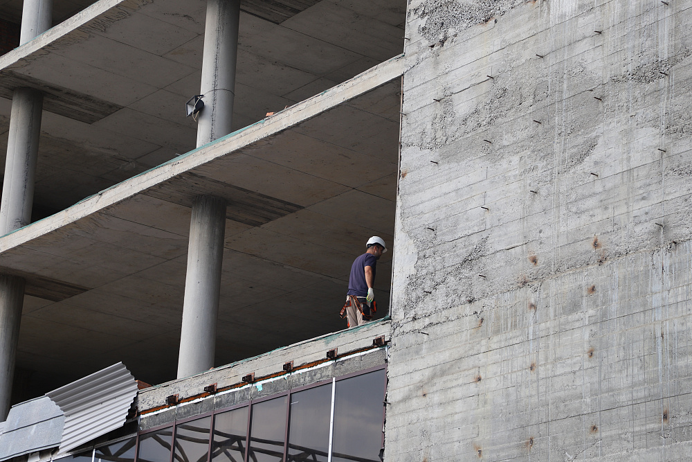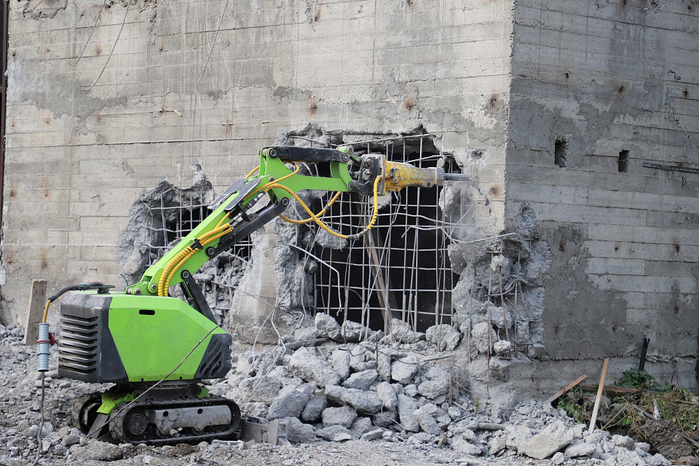 Сегодня стартовал демонтаж недостроенного здания на набережной р.Терек. Специализированная робототехника приступила к первому этапу работы. В настоящее время проделываются технические отверстия, через которые остатки конструкции будут спускать вниз.