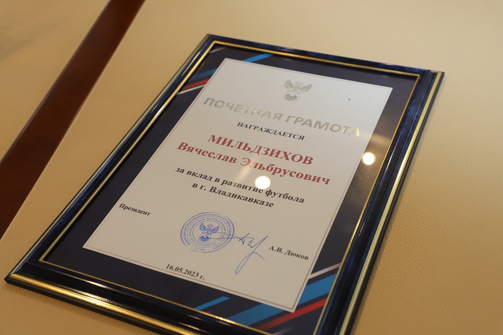 По окончании заседания Вячеславу Мильдзихову была вручена почетная грамота президента Российского футбольного союза Александра Дюкова «За вклад в развитие футбола в г. Владикавказе».
