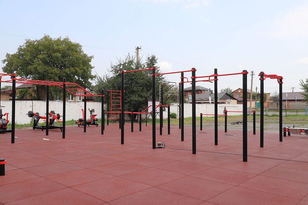 Спортплощадка оснащена регулируемыми турниками и разноуровневыми перекладинами, лавками для пресса, скамьей для наклонов и столом для отжимания, а также силовыми тренажерами для разных групп мышц.